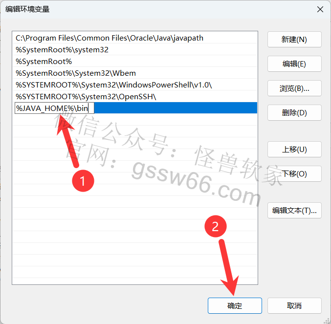 19,输入“%JAVA_HOME%\bin”,点击“确定”