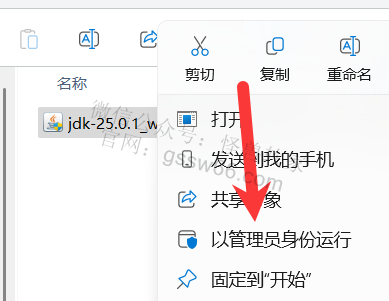 04,找到并选中安装程序“jdk-25.0.1_windows-x64_bin.exe”,点击鼠标右键,点击“以管理员身份运行”